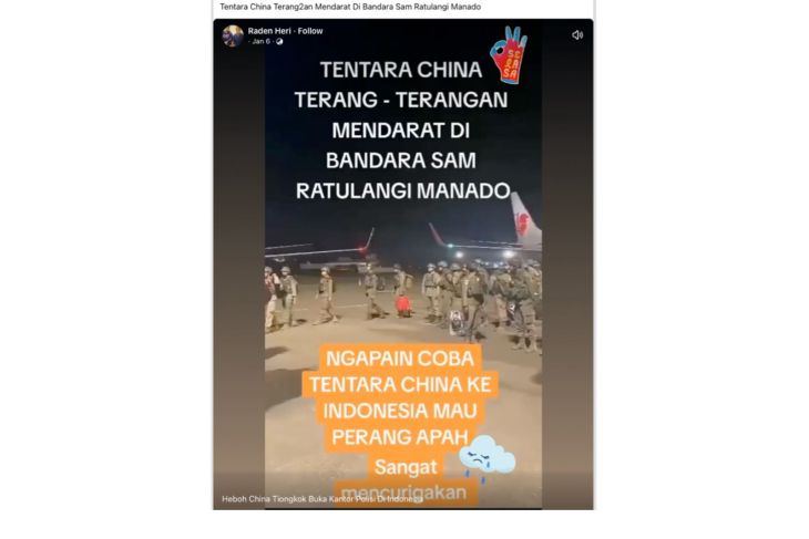 Jakarta (ANTARA/JACX) – Sebuah video yang diunggah di Facebook pada 6 Januari menampilkan sejumlah orang berseragam militer turun dari pesawat, lalu dinarasikan seolah-olah “tentara China” mendarat di Bandara Sam Ratulangi, Manado.